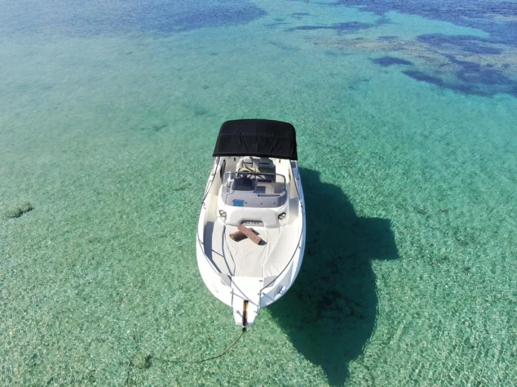 La distribución de su cubierta está diseñada para aprovechar el espacio al máximo, ofreciendo un amplio solárium en proa, ideal para tomar el sol, y una cabina cerrada donde resguardarse o descansar. Entre sus comodidades destacan la ducha de agua dulce, el toldo bimini para protegerse del sol y una práctica plataforma de baño, que facilita el acceso al agua en las calas más exclusivas de la isla.