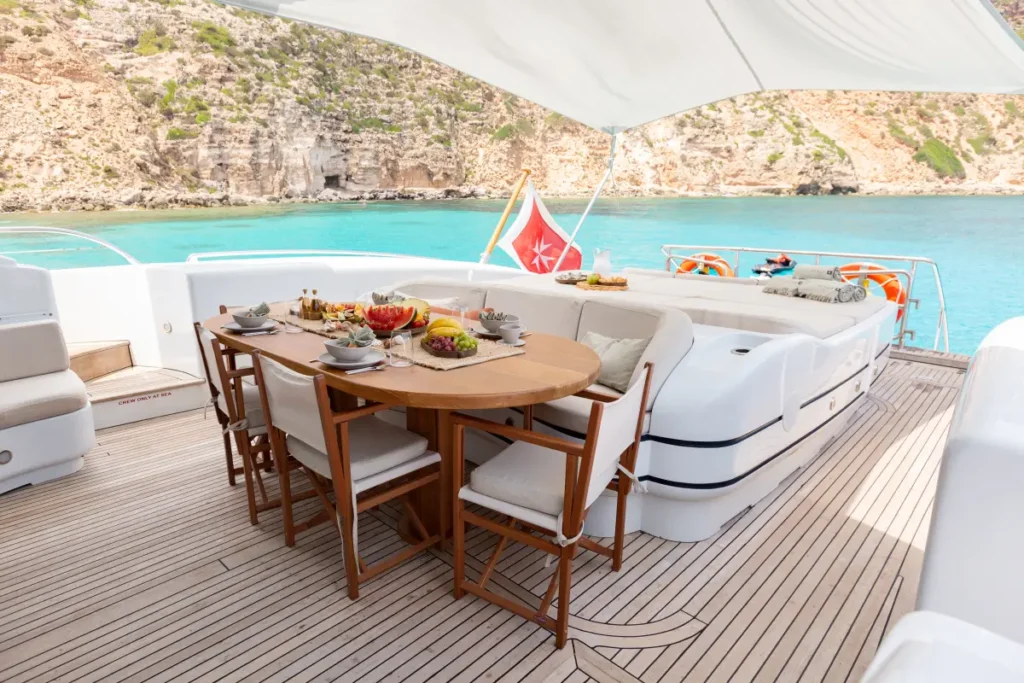 La cubierta principal ofrece amplias zonas de descanso, con soláriums en proa y popa, además de un área de comedor al aire libre. La plataforma de baño es ideal para nadar o practicar deportes acuáticos.