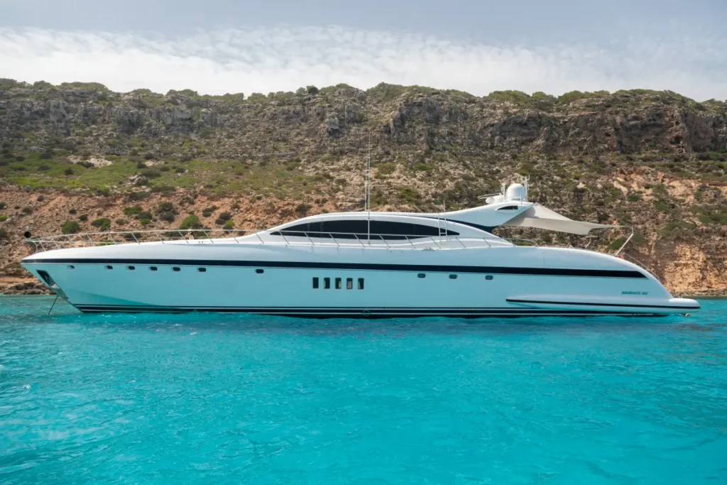 El Mangusta 108 es una embarcación deportiva de gran tamaño, con 33 metros de eslora y un rendimiento impresionante. Conocido por su estilo aerodinámico y su potencia, este yate es ideal para quienes buscan velocidad y lujo en partes iguales.