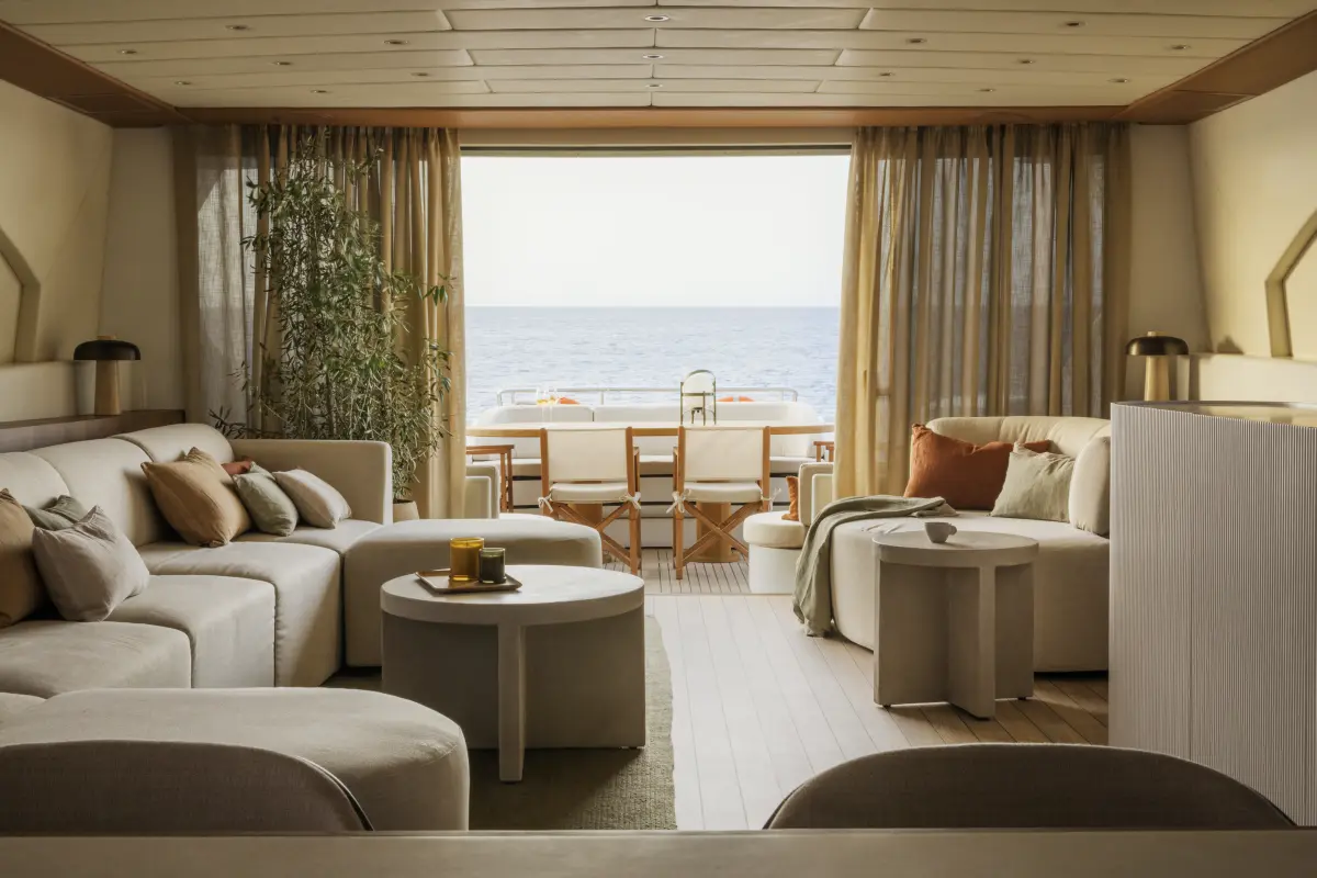 El interior del Mangusta 108 es elegante y acogedor, con una distribución bien pensada y detalles de alta gama. El salón principal, con grandes ventanales, ofrece un ambiente relajante y luminoso, perfecto para disfrutar de momentos de tranquilidad a bordo.