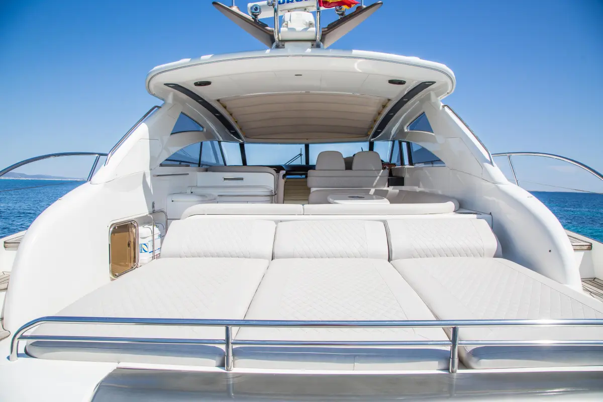 Su cubierta ofrece amplias zonas de solárium en proa y popa, una zona de comedor exterior y una plataforma de baño hidráulica, ideal para fondear en calas escondidas.