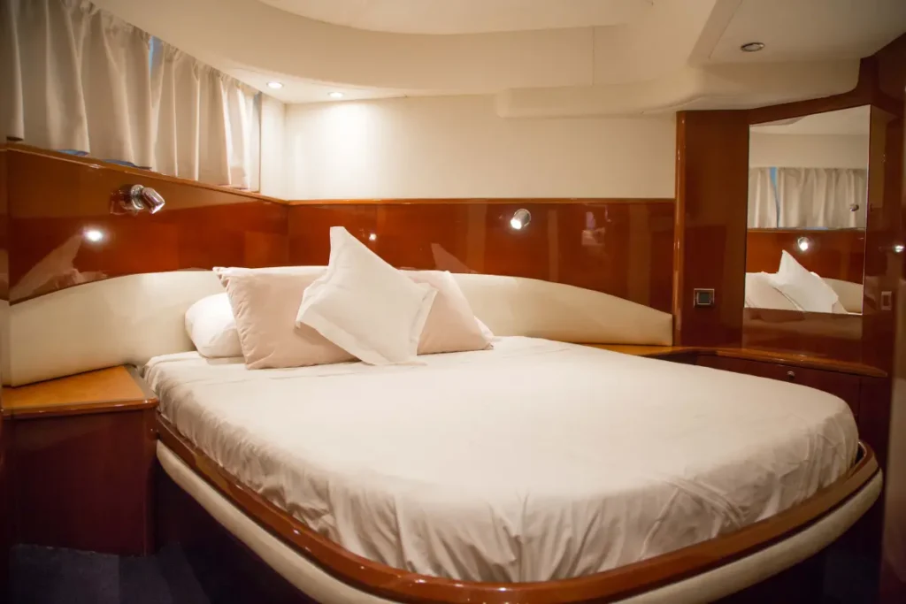 El interior del Princess V58 es espacioso y lujoso, con tres camarotes dobles, dos baños completos y una cocina completamente equipada. Su salón ofrece un espacio cómodo y luminoso para relajarse o disfrutar de una copa al final del día. Con una motorización potente y un casco diseñado para una navegación suave, el Princess V58 garantiza una experiencia única a bordo, combinando rendimiento y confort en cada travesía.