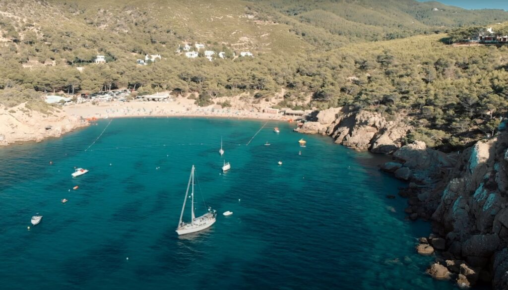 Pero si has alquilado un barco, la experiencia es notablemente diferente. Podrás acceder en la pequeña bahía que forma la cala, fondear tu yate o tu velero y disfrutar desde allí de la música que recarga de energía a todos los presentes. Mientras escuchas el repiqueteo de tambores, timbales y el movimiento de quienes se animan a bailar, vivirás una de las escenas que nos recuerda la más pura esencia hippie de la Ibiza de los años setenta.